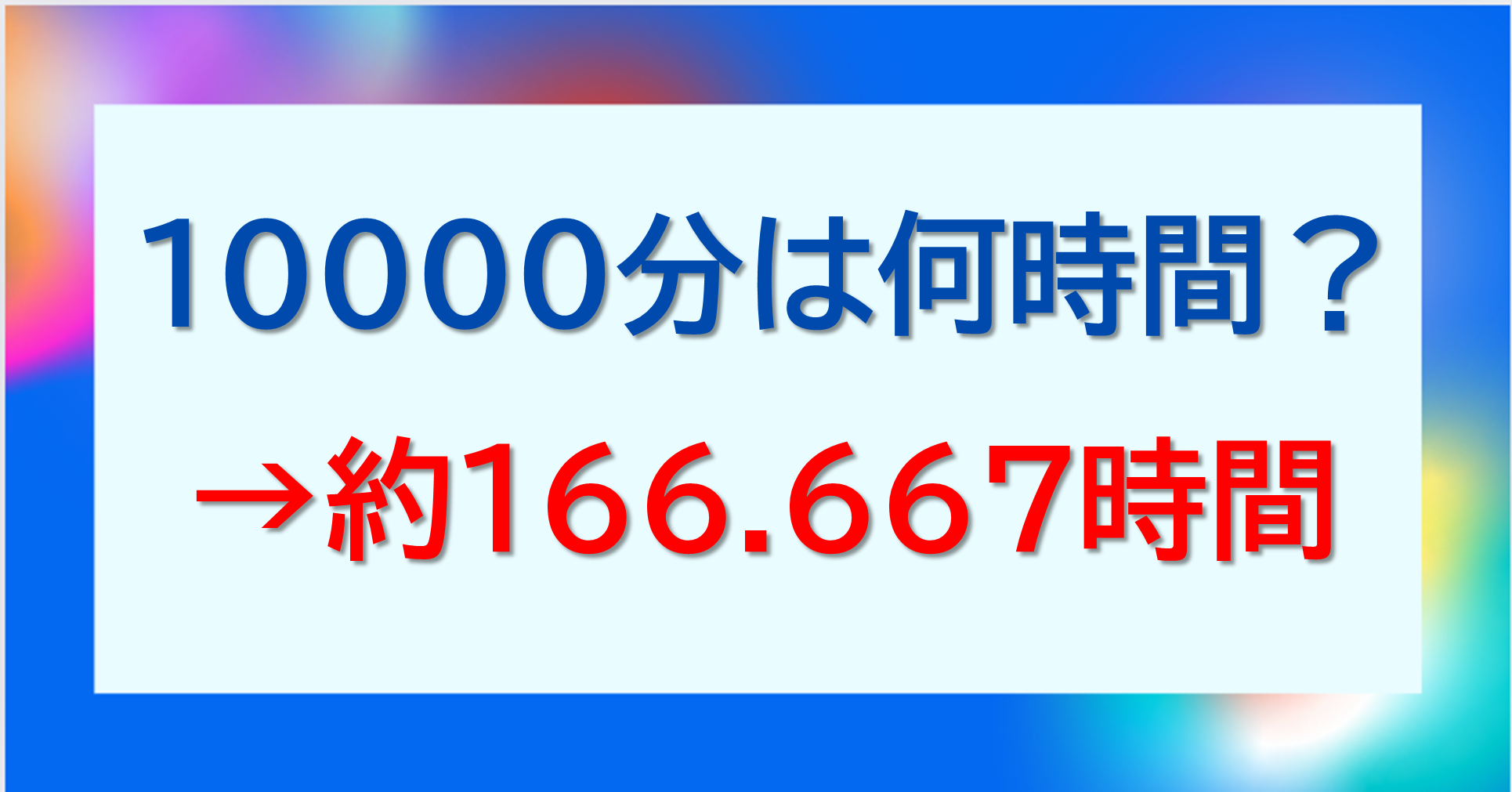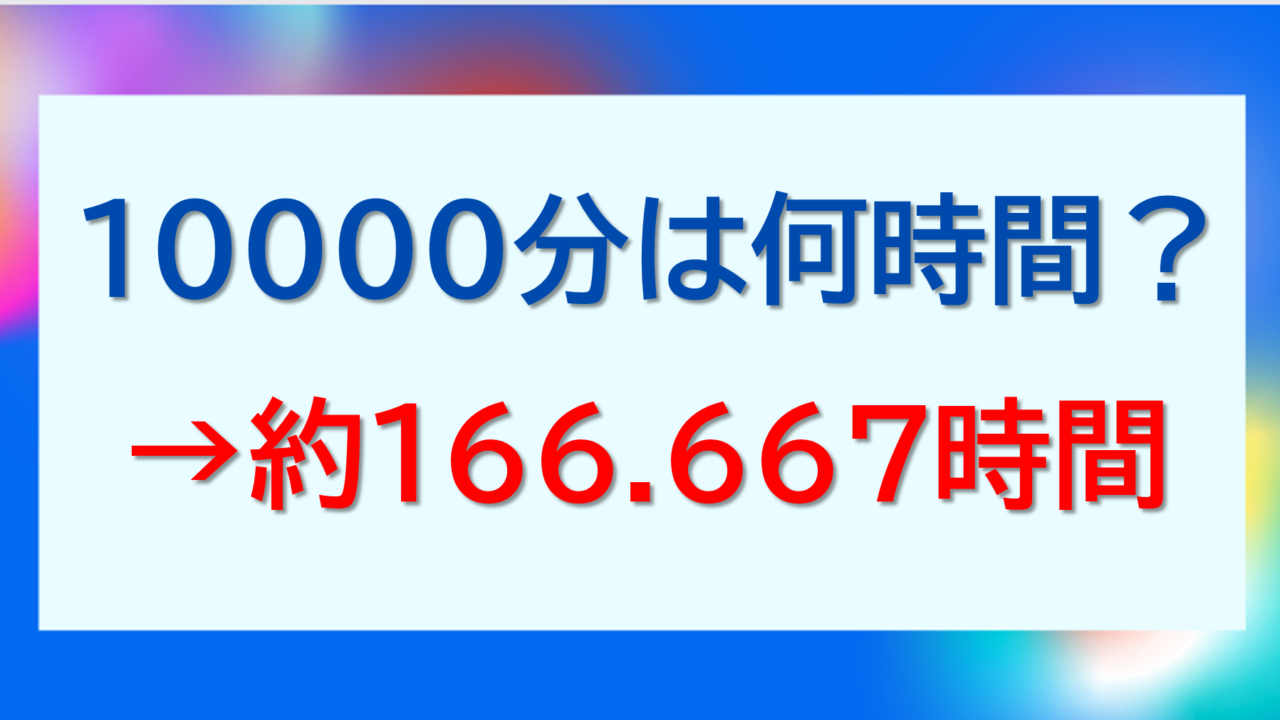 このような背景もあり、ここでは「10000分」に注目し、10000分は何時間か(小数や分数)?10000分は何時間何分か?何秒か?について解説していきます。