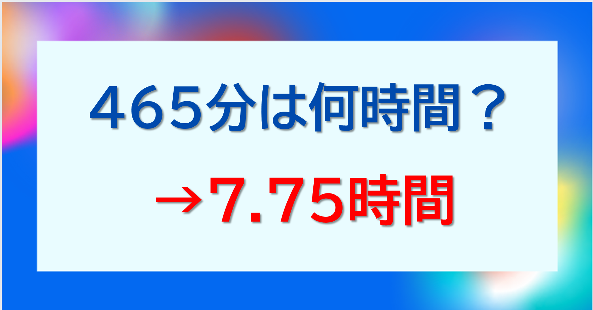 このような背景もあり、ここでは「465分」に注目し、465分は何時間か(小数や分数)?465分は何時間何分か?何秒か?について解説していきます。
