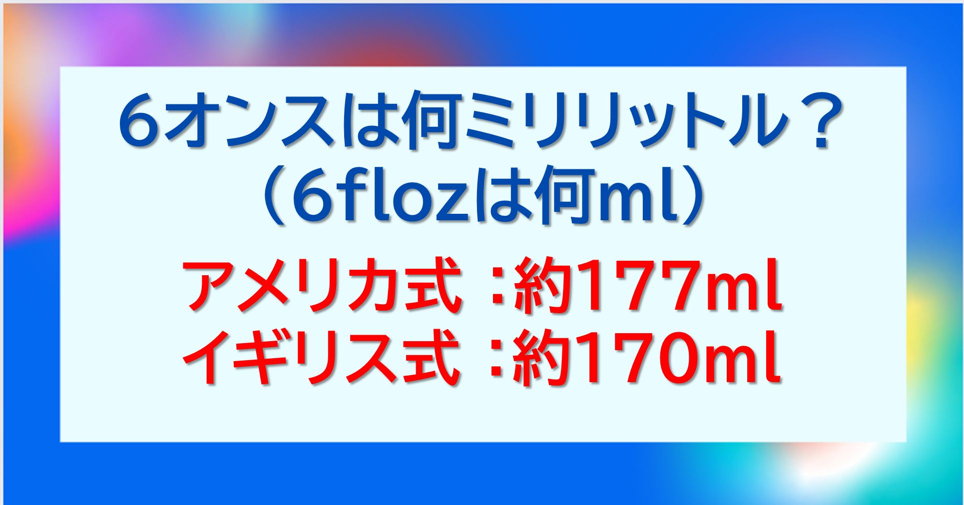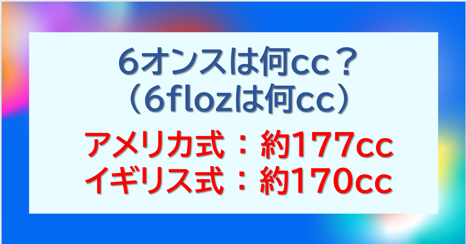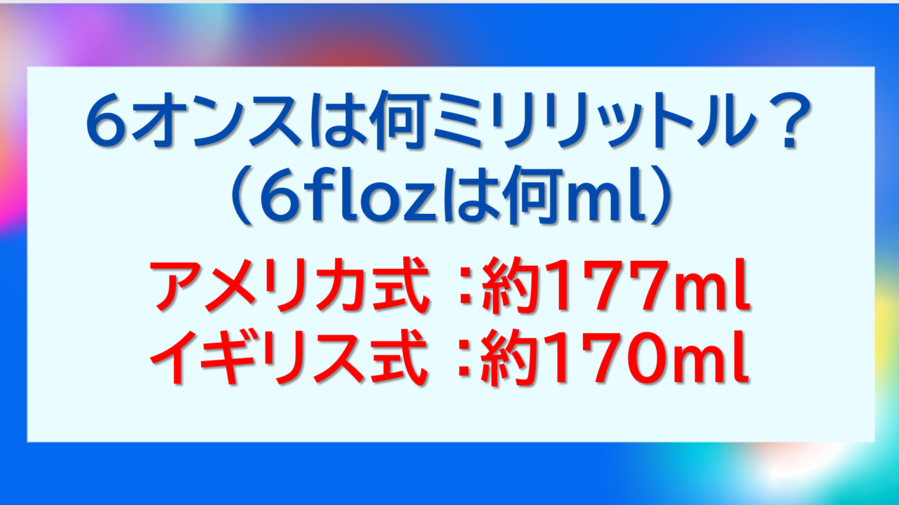 以上のように、6オンスはおよそ177ml、0.177リットル、177cc(177cm3:立方センチメートル)になります。