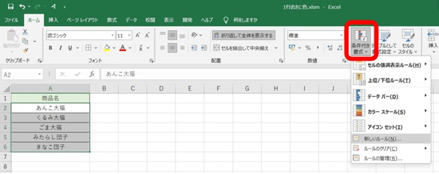次に、ホームタブの「条件付き書式」をクリックし、「新しいルール」を選択します。
