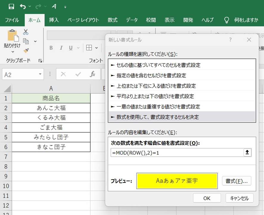 「書式」のタブで塗りつぶしの色を選択し、「数式」のタブで数式に「=MOD(ROW(),2)=1」と入力したら、「OK」をクリックすれば完了です。