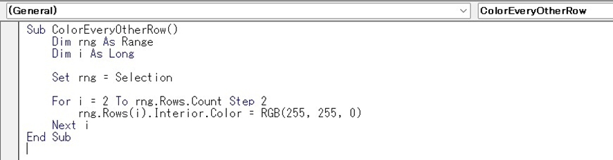 rng.Rows(i).Interior.Color = RGB(255, 255, 0)