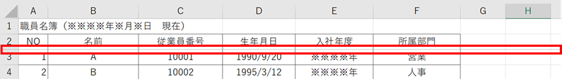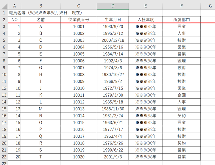 完了すると少しわかりにくいですが、常に表示したい行の下に線が入ります。今回は2行目と3行目の間に線が入ります。