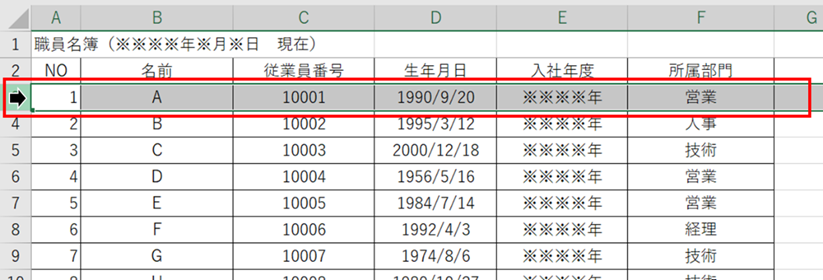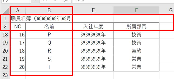 そうすると右や下にスクロールしても、1行目と2行目、1列目(A列)と2列目(B列)が常に表示されるようになります。