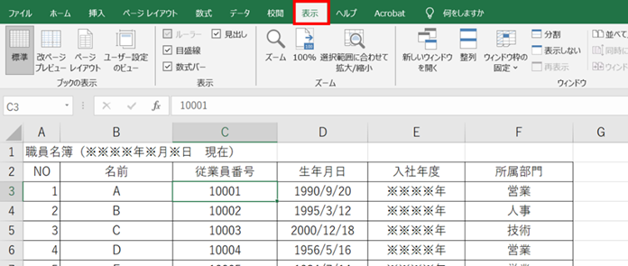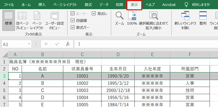 ・上から3行目を選択し、「表示」→「ウィンドウ枠の固定」をクリック