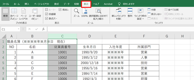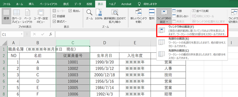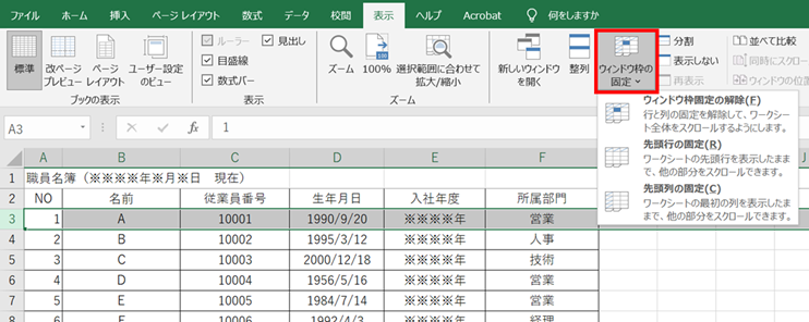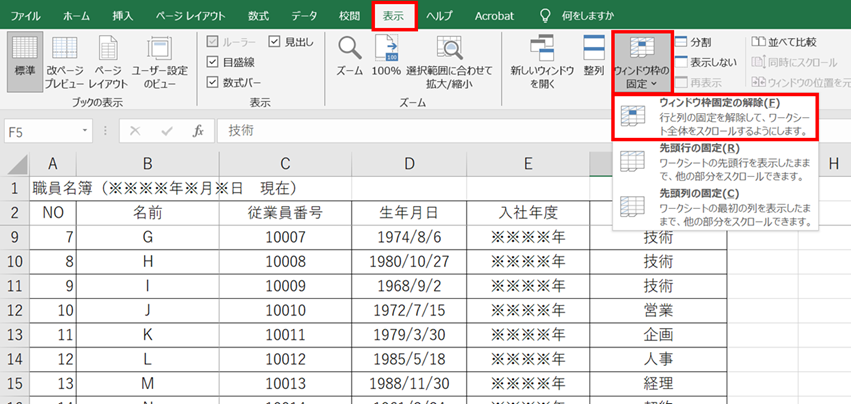 ・固定を解除する場合は、「表示」→「ウィンドウ枠の固定」→「ウィンドウ枠固定の解除」の順で選択