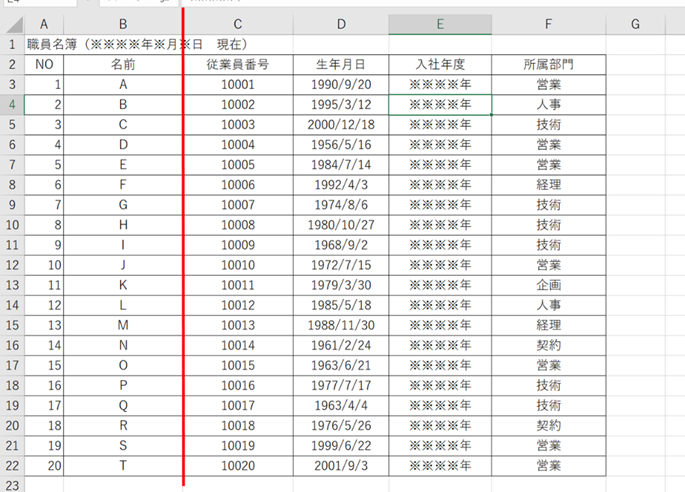 完了すると少しわかりにくいですが、常に表示したい列の右側に線が入ります。