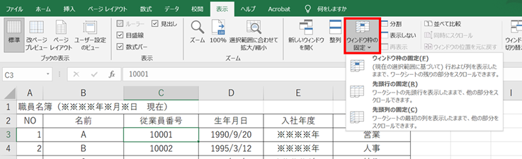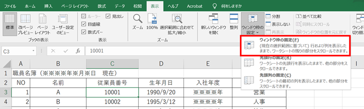 「ウィンドウ枠の固定」をクリックすると、「ウィンドウ枠の固定」、「先頭行の固定」、「先頭列の固定」の3つが選択できるようになります。