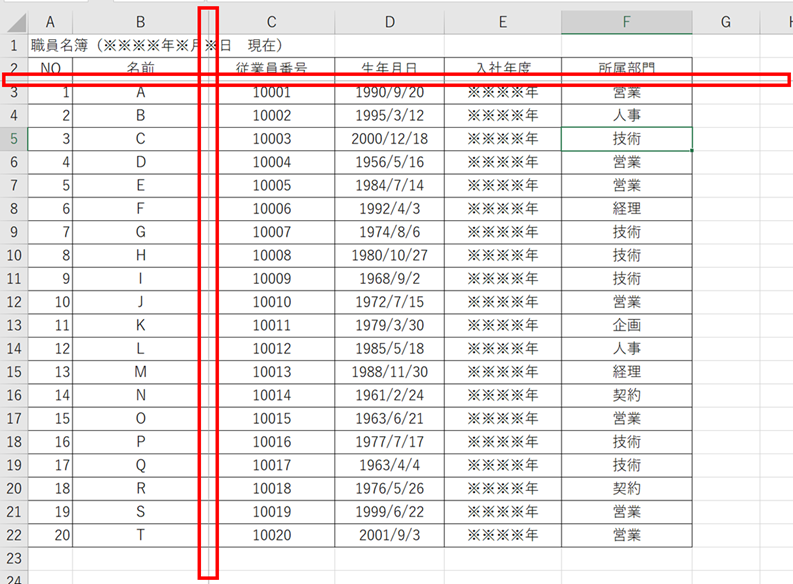 完了すると少しわかりにくいですが、常に表示したい行の下と、列の右側に線が入ります。