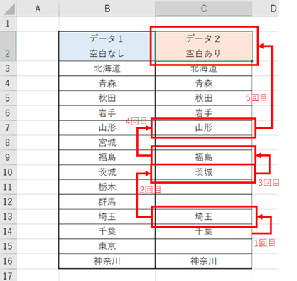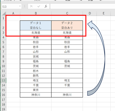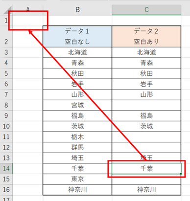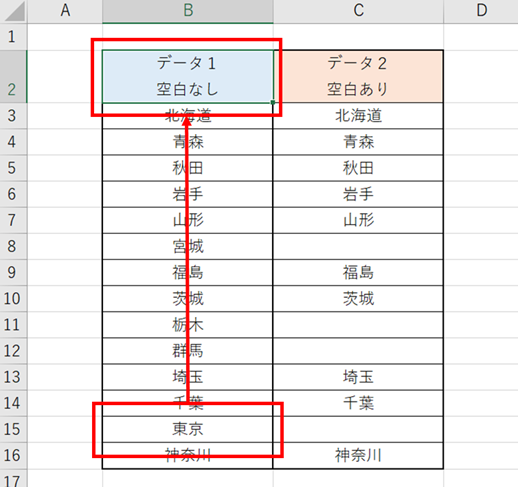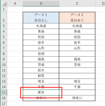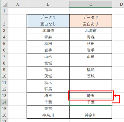 C14セル(神奈川)で、「Ctrl+↑」を押しても、空白の前のC13セル(埼玉)で止まってしまいます。