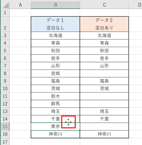 B15セル(東京)の上の線のところにカーソルを持っていきます。