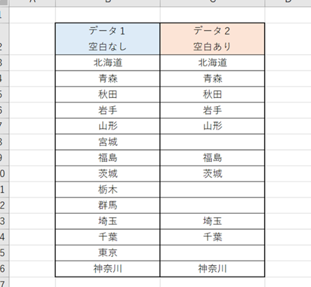 下の図の「データ2 空白あり」の列のように、途中空白がある場合に一番上まで移動