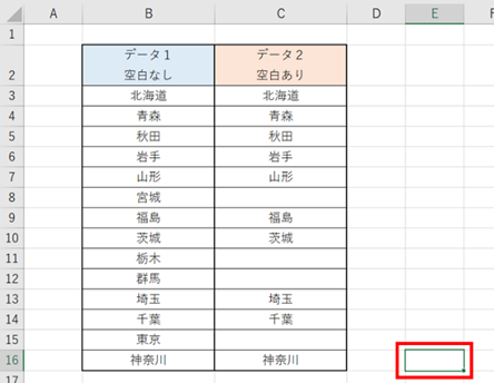 まず、表の外の適当なセルを選択します。今回はE16セルを選択します。