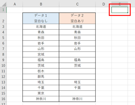 そうすると、選択しているセルが表の一番上のB2セル(データ1 空白なし)に