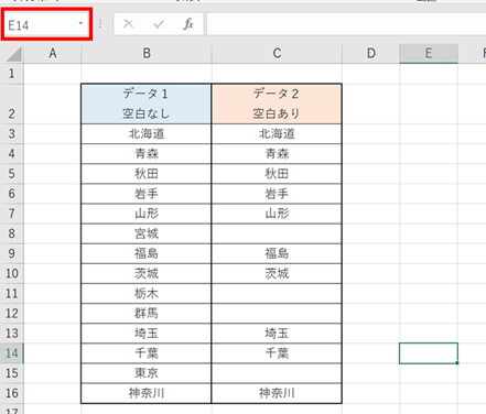 現在は、E14セルが選択されているので、□の欄も「E14」となっております。