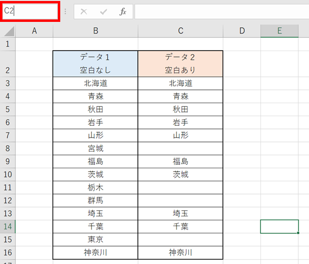 Enterを押すと、C2セル(データ2 空白あり)へ移動します。