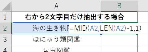 LEN(A2)-1で右から2文字目の位置を指定し、MID関数でその位置から1文字分を取り出しています。