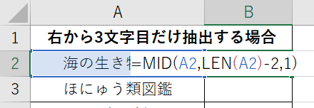 LEN(A2)-2で右から3番目の位置を指定し、MID関数でその位置の1文字を取り出しています。