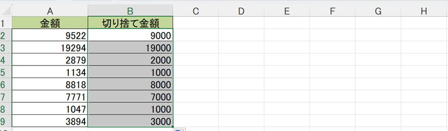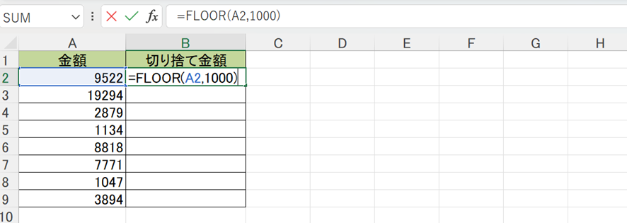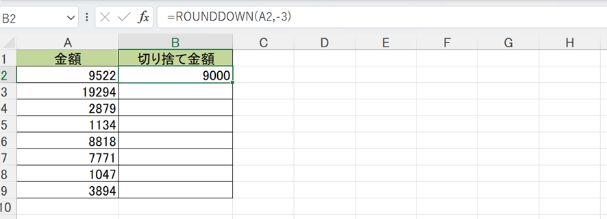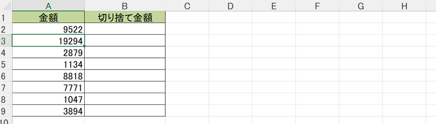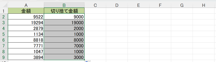 A列の金額を1000円未満で切り捨てて、B列に表示させるには以下の数式を使います。