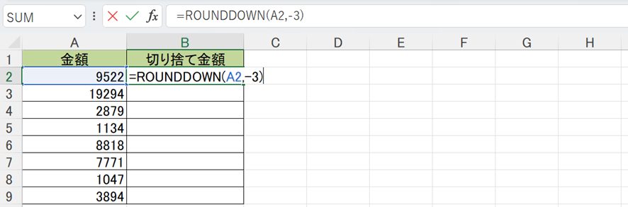 この数式の意味は、A2セルの値を1000の倍数に切り捨てるという意味になります。