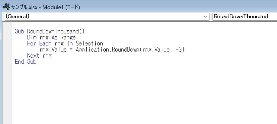 このコードは、選択範囲のセルに対して、1000円未満を切り捨てる処理を行います。