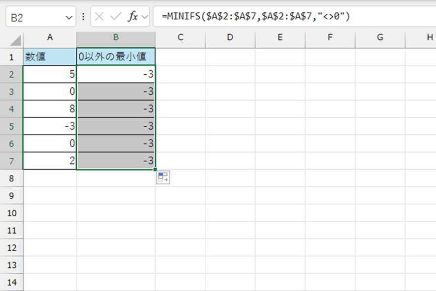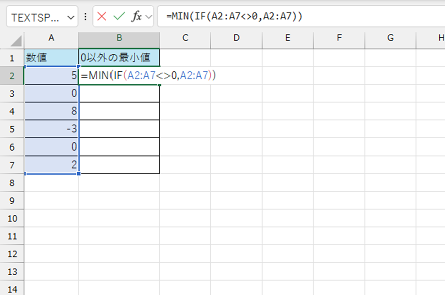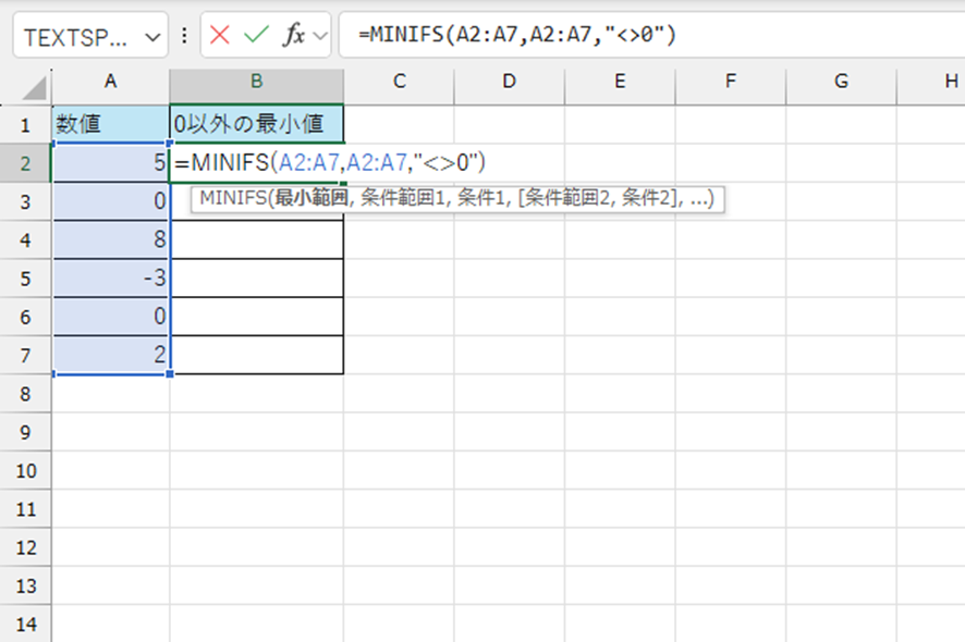 この場合、A2:A7の中で0以外の値を持つセルの最小値が算出されます。