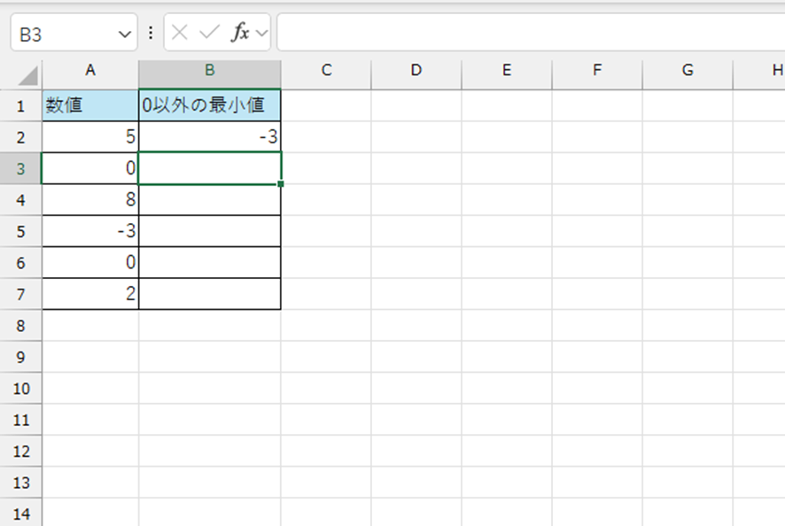 最終的な最小値をセルB2に出力します。0以外の値が1つもない場合は、メッセージを表示するようにしています。