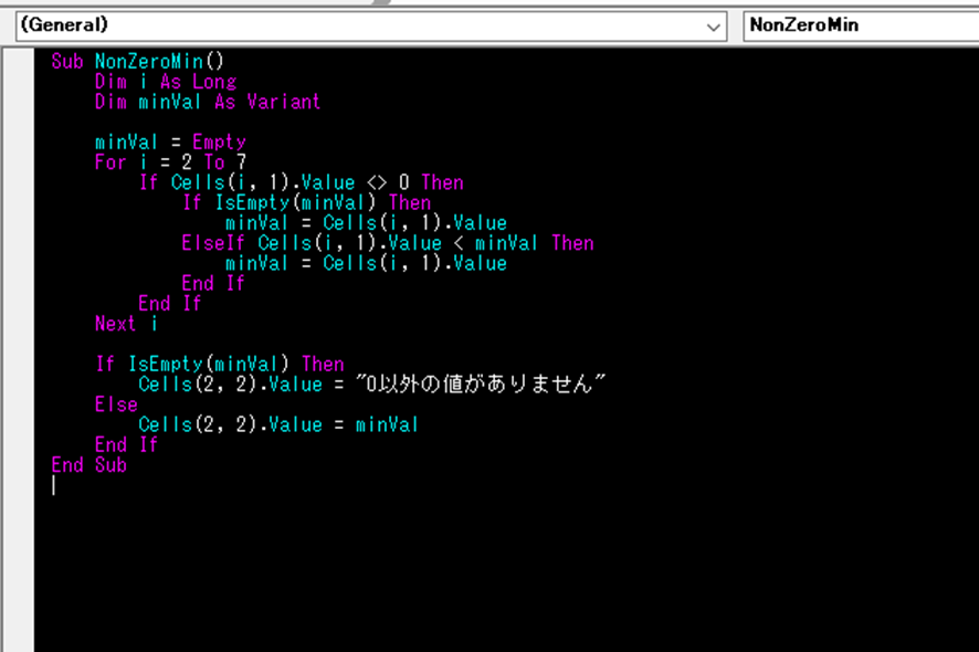あらかじめminValは空白で初期化し、IsEmpty関数で最初の0以外の値を判定しています。
