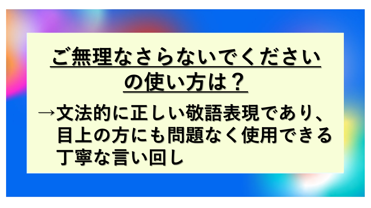 全体として「無理をしないでください」という意味を、非常に丁寧に表現しています。「ご」「なさる」「ください」という三つの敬語要素が組み合わさっているため、目上の方や取引先に対して使える適切な敬語表現といえるでしょう。文法的にも問題なく、ビジネスシーンで広く使われている表現なのです。