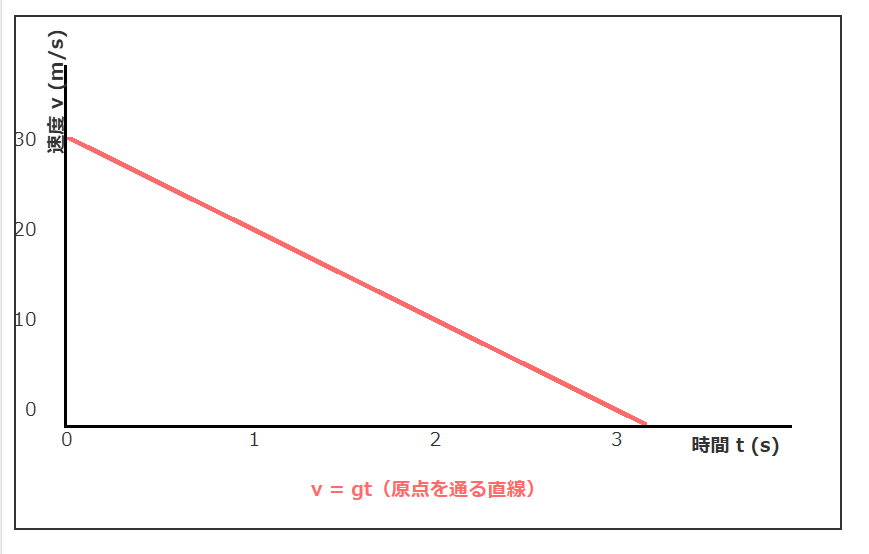 v-tグラフの傾きは加速度を表します。自由落下では加速度が常に重力加速度gで一定であるため、グラフの傾きも一定となるのです。
