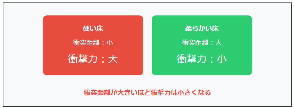 上記の式から、衝突距離dが小さいほど衝撃力Fは大きくなることがわかります。これが衝撃吸収材が重要な理由です。