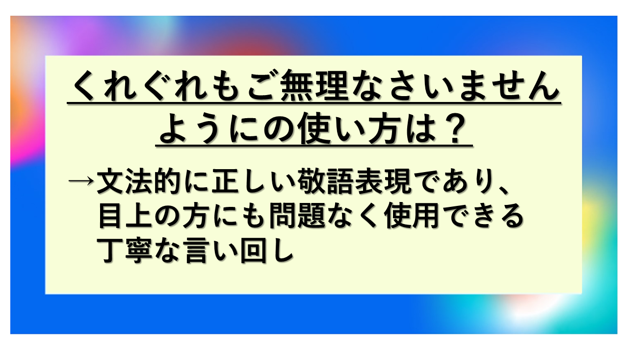 「くれぐれもご無理なさいませんように」は、相手の健康や負担を深く気遣う正しい敬語表現であり、ビジネスシーンで広く使える便利なフレーズです。目上の方や取引先に対しても問題なく使用でき、特に繁忙期や体調が懸念される時期に効果的な言い回しといえるでしょう。