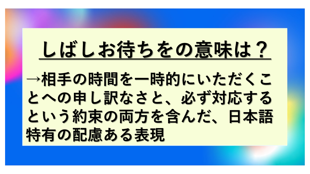 「しばしお待ちを」は、相手の時間を一時的にいただくことへの申し訳なさと、必ず対応するという約束の両方を含んだ、日本語特有の配慮ある表現といえるでしょう。