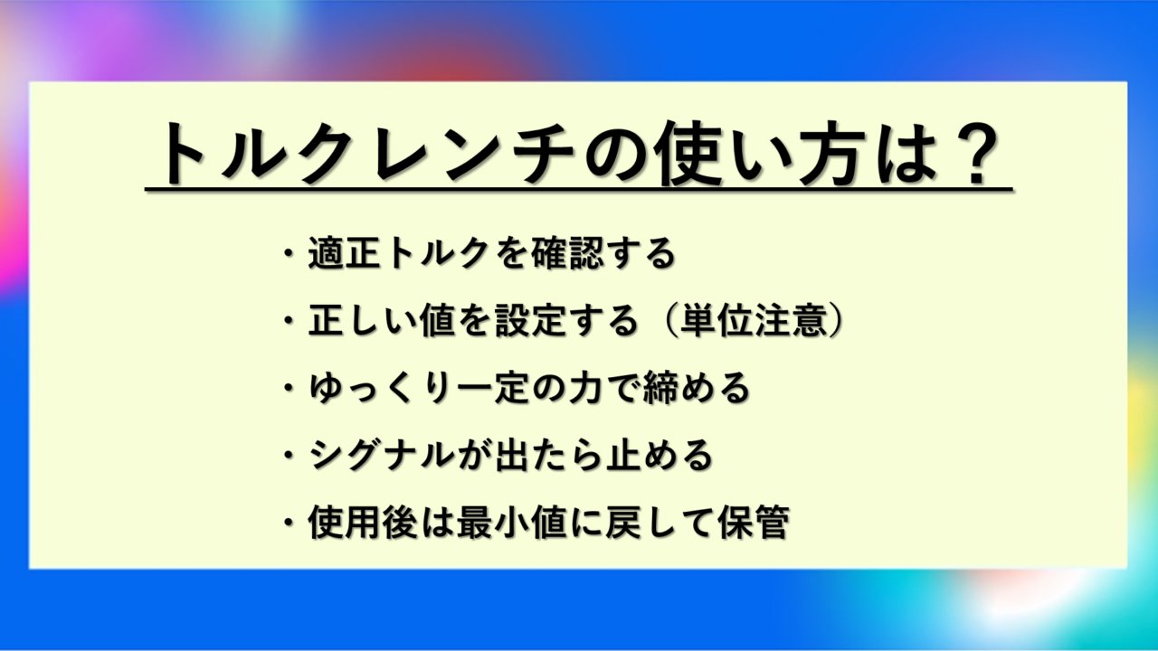 続いては、トルクレンチを使う際に気をつけるべきポイントを見ていきましょう。
